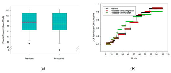 Figure 9a, the median value of the proposed method is higher than that of the previous method, while the average value of the proposed method is lower than that of the previous one. The main reason for this is that the proposed method eliminates unnecessary hosts from running in the system, which ensures efficient resource management. The CDF for power consumption is similar to