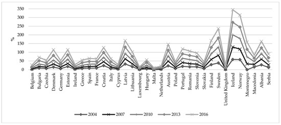 Thus, the results of the analysis show that most of the EU countries have already achieved the indicated goals before 2020 (Figure 1) and every year, the share of renewable energy in the gross final consumption is only growing. The leaders among the EU countries by the share of renewable energy in the gross final energy consumption are Iceland, Norway, Sweden, and Finland. Noteworthy, each EU country has its own goals on renewable energy: Germany has planned the share of 18%, Poland—15.5%, Lithuania—23%, Latvia—40%, Moldova—17%, and Estonia—25% [4,5]. A total of 11 countries of the EU had already achieved the set goals on renewable energy sources (RESs) in 2015, including Estonia and Lithuania.