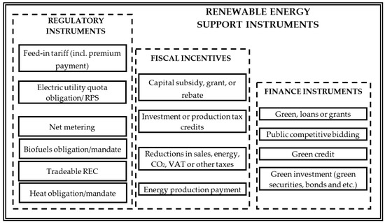 The obtained results allow the conclusion to be made that, for EU countries, renewable energy has a huge impact on economic growth, as the correction retraction with economic growth leads to an increase in the energy consumption from renewable energy. However, the candidate and the potential candidate countries for EU membership should provide a more reactive policy on developing renewable energy consumption. In this case, the EU experience allows the conclusion to be made that, for the first step, supportive financial and non-financial mechanisms should be developed and implemented by the candidate and the potential candidate countries for EU membership. The consolidated data of effective renewable energy support policies are shown in Figure 2 [50,60,61,65].