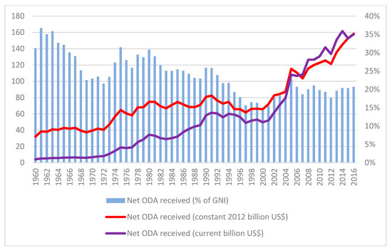 - World Bank. Net Official Development Assistance and Official Aid Received (Current US$). Available online: http://data.worldbank.org/indicator/DT.ODA.ALLD.CD (accessed on 26 August 2018).