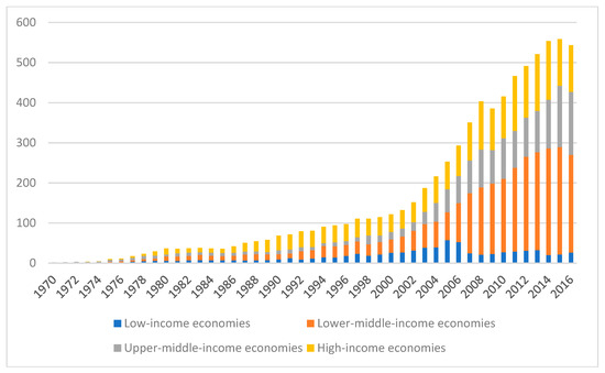 In this paper, we understand the term remittance flows as the sum of personal remittances received. Personal remittances comprise several different transaction formats—personal transfers, compensation of employees and capital transfers between households. Data are made up to the sum of two items defined in the sixth edition of the IMF’s Balance of Payments Manual: personal transfers and compensation of employees [17]. Personal transfers consist of all current transfers in cash or in kind made or received by resident households to or from non-resident households. Personal transfers thus include all current transfers between resident and non-resident individuals. Compensation of employees refers to the income of border, seasonal and other short-term workers who are employed in an economy where they are not residents and of residents employed by non-resident entities [19]. In the list of standard components of the balance of payments accounts, “workers’ remittances” have been replaced by “personal transfers” (for more details, see Reference [20]). Figure 2 shows the rising trend of remittances flows.