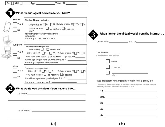 Data were collected by distributing a questionnaire (Figure 1) at an ECC educational activity, in which the young people reflected on their relationship to technology consumption. The questionnaire was designed through a validation and reformulation process in the framework of a pilot test. This process ensured the functionality of the questionnaire with respect to the outlined objectives and its consequent validity. The questionnaire contained dichotomous questions with two possible answers, closed multiple choice questions, and open questions. The questionnaire was divided into three blocks: