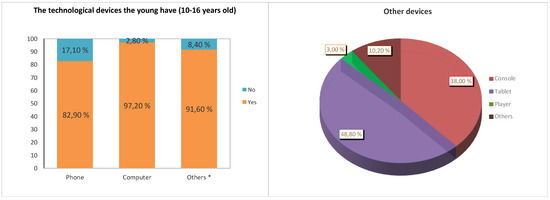 Charts of percentages of technological devices that young people have (10–16 years old).