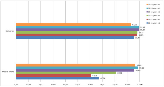 These results indicate that the computer is a common technological device in youth’s daily lives, possibly because this device has been added and normalised within the family, which in many households becomes an electrical appliance of similar importance and scope to others such as the television. This coincides with the report de ‘la sociedad en red’ [27], stating that in 2016 the computer started to replace the television as the technological equipment most present in Spanish households. Perhaps the fact that the computer is a technological device conceived more as family-based and collective compared to the mobile phone, which is individual and personal, means that young people from the age of 10 have a computer for either private or family use and this situation continues as they grow older.