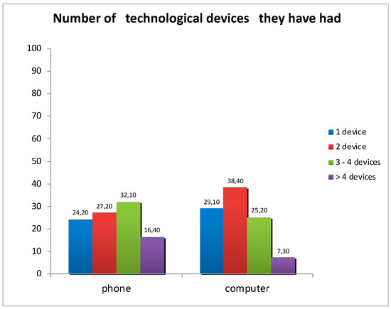 The average number of devices that young people have had is 2 for all cases, although regarding mobile phones, the majority have had 3 or 4 over the course of time (i.e., they change them more frequently), which was higher than the results for upgrading computers (Figure 4).