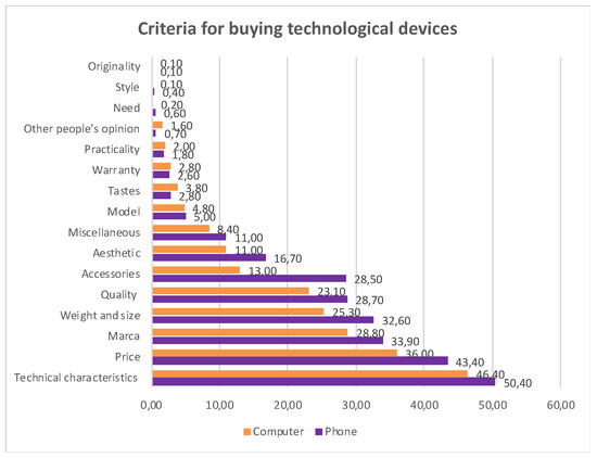 The most employed criteria—technical characteristics and price—have the most influence among youth for buying both mobiles and computers. As for the mobile phone, it merits mention that youth place more importance on criteria related to accessories, weight, and size (Figure 5).