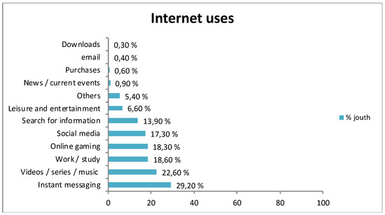 With regard to using new technologies (Figure 7), there is a wide range of uses, although a clear difference is detected between those that are most used and least used. The apps related to instant messaging were the most frequently used by young people, followed by those for watching videos and listening to music, for study purposes, games, and social media, which had similar percentages.