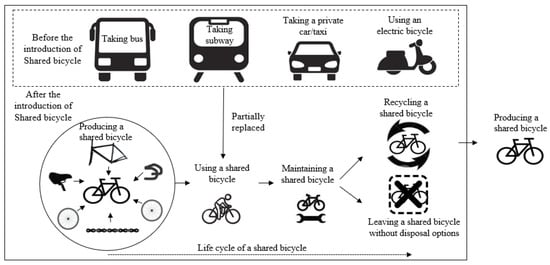 As a representative of sharing economy and product service system (PSS), bicycle sharing has been adopted in major cities such as Shanghai, London, Chicago, and Paris [1,2]. In China, it has reported that more than 23 M shared bicycles have been introduced and attracted 400 M users as of January 2018 [3], the rapid development of bicycle sharing service has created over 100,000 jobs [4]. OFO, one of bicycle sharing startups in China, has approximately 8 M yellow-framed bicycles in more than 170 cities in nine countries. The company is reported to have approximately 25 M orders per day and 3 B cumulative orders through to July 2017 [5]. In March 2018, OFO received an investment of $866 M USD, setting a record for the bicycle sharing industry [6]. Bicycle sharing has also enjoyed a substantial growth in the United States from 2010 to 2016; the number of shared bicycles has reached over 42,000 in 2016, while the figure was only 1600 in 2010 [7]. However, the environmental sustainability of bicycle sharing is a center of controversy, as this traveling mode is under heavy criticisms, such as oversupply and low recycling rate [8]. Furthermore, there is little knowledge about the environmental performance of this emerging traveling mode. Caggiani et al. [9] stated that bicycle sharing can significantly reduce air pollution, since it provides users with a carbon-free traveling mode. This argument is agreed by other scholars like Shaheen et al. [10] and Otero et al. [11] and Cohen [12], yet, their claim lacks of quantitative support.