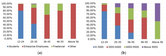 Cross analysis of respondents’ socioeconomic characteristics: (a) gender and age, and (b) income level (RMB per month) and age.