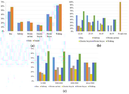 The socioeconomic characteristics of the respondents are linked to the changes in their traveling modes, as shown in Figure 3. Figure 3a shows that shared bicycle is predominantly used to substitute walking and bus taking; this observation is consistent with the finding of Fishman et al. [76]. It is shown that the modal shift from taking private car/taxi, riding on electric bicycle, taking subway, and walking to shared bicycles between female and male users are similar, in general, but have some noticeable differences. Female users are more likely to replace buses with shared bicycles and less to replace their own bicycles. This can be explained by the fact that more males owned and used private bicycles before the introduction of bicycle sharing [60].