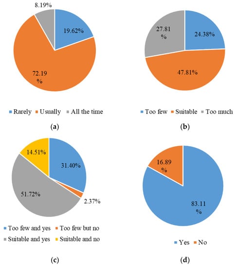As shown in Figure 4a, 72.19% of respondents can easily find a shared bicycle when they need, while 19.62% of respondents could find a shared bicycle all the time, indicating that the supply of shared bicycle is basically sufficient in the opinion of most respondents. Figure 4b shows that 47.81% of respondents believe that the volume of shared bicycle is suitable, while 27.81% of respondents thought that there are already are too many shared bicycles. Most of the respondents (83.11%) expressed their willingness towards using shared bicycles (Figure 4d), regardless whether they think of the number of existing shared bicycles is sufficient. The quantitative impacts of increased the number of shared bicycles needs to be further explored.