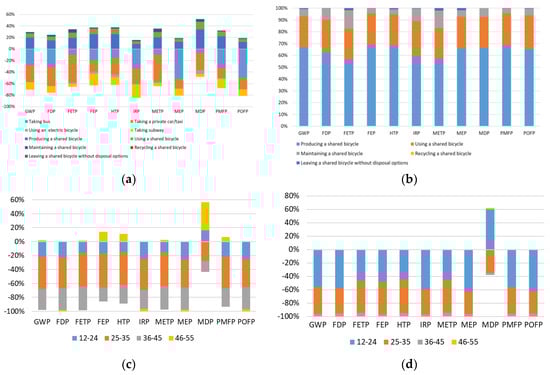 Figure 5c,d shows that the LCA results are displayed according to age. It’s interesting to note that the contribution of users between 12–24 years to the bicycle sharing’s environmental friendliness is less than that of users between 25–35 years and 36–45 years, although the number of users between 12–24 years is the highest. Combined with Table 4, users between 25–35 years have the highest average mileages using shared bicycles to replace other traveling means, followed by those between 36–45 years. This shows that opening up the 25–35 year old user market and increasing its user stickiness would bring more environmental benefits to bicycle sharing.