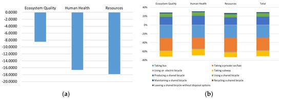 The decomposition of the LCA results into the processes that belong to the studied system is displayed in Figure 5a. It shows that the environment impacts of each traveling process can be ranked in a descending order: taking a private car/taxi and bus, taking subway, using a shared bicycle, and using an electric bicycle. This result is inconsistent with the sequence of traveling means ranked according to annual greenhouse gas emissions [79]; the order was: car taking, bus-taking, and subway-taking. The reason behind this difference lies in the different coverages of the two works; this study explores the travel of Chinese residents of all ages, while Czepkiewicz et al. [79] studied the travelling behaviors of Dutch residents aged 25-40. People of different ages in different regions might have distinctively different traveling patterns. This order proposed in this work indicates that replacing buses and private car/taxi by shared bicycles can bring are more environmental benefits, mainly attributing to the longer distances traveled by these means, see Table 4.