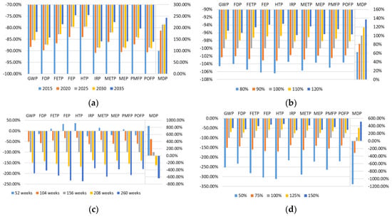 It can be seen from Figure 7a that the environmental benefits of all the categories decrease with the aging population. This is attributed to that older residents use bicycles at a much lower frequency; as the proportion of older residents increases, the replaced mileages will decrease. Figure 7a shows that from 2015 to 2035, the values of all the categories except MDP will drop by 12.12%, 3.17%, −0.31%, and 2.88% relative to the LCA results of the base scenario from the previous period, and the value of MDP would be decreased by an average extent of 87.05%, 26.23%, 0.87%, and 28.75% of the base scenario. The fastest decreases of the environmental benefits during 2015–2020 can be attributed to the rapid decline in the proportion of residents aged 12–24, who are the major users of shared bicycles. The results indicate that the aging population is negative for the environmental benefits of shared bicycles. Combining the results presented in Section 3.2., increasing the number and stickiness of users aged 25–45 can offset the negative impact of aging to some extent.