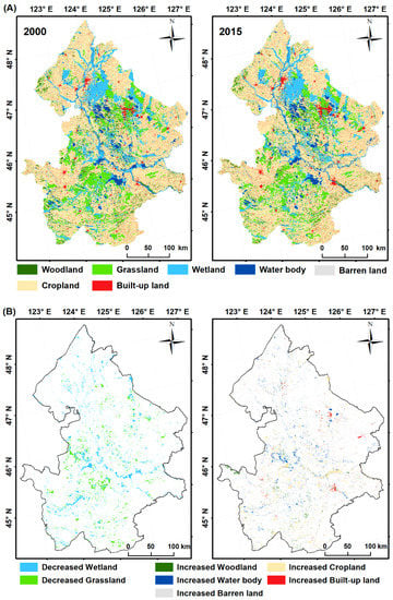 Figure 4b shows the spatial location of decreasing and increasing land cover. Areas of woodland, water body, and barren land increased slightly by 18,248 km2, 4350 km2, and 2304 km2 from 2000 to 2015, respectively (Table 2). Expanded woodlands were mainly distributed in the western and south parts of the study area. Water body expansions were mainly distributed in the central part. Barren land increase was mainly observed in the central and southwestern parts. The corresponding increase was dominated by cropland growth, an increase of 146,458 km2 from the beginning of the period to its end. Croplands increased in almost every part over the study area, especially in the southwestern and central parts. Built-up land had the most significant increase rate (7.87%) from 452,421 km2 in 2000 to 488,016 km2 in 2015, due to the obvious expansion of cities and road construction in the eastern and southeastern parts of the study area.
