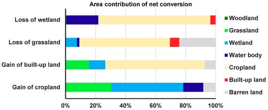 Area contribution of net conversions to changes in main land cover types during 2000–2015.