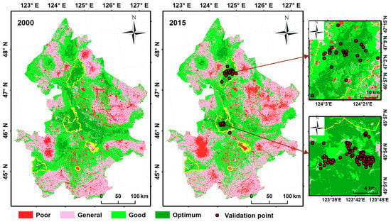 Table 4 shows habitat areas with poor and general suitability grades, which increased by 464,233 km2 and 590,531 km2 from 2000 to 2015, respectively. Habitat areas with good grade decreased by 334,037 km2, whereas, those with optimum grade occupied the least coverage with a sharp decrease between 2000 (13.04%) and 2015 (6.00%). The change rates of habitat suitability for waterbirds for grades poor, general, good, and optimum were 47.96%, 14.57%, −8.64%, and −53.99%, respectively. Optimum habitats were mostly converted into good suitable habitats (90.17%). In contrast, during 2000–2015 general habitats increased by 5905.31 km2, and good habitats became the primary source of net increase in general habitats. The increase in poor habitats occurred mainly at the expense of general habitat loss (90.94%).