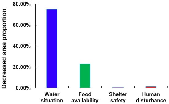 Figure 6e,f shows the spatial patterns of factors giving the lowest and the highest contribution to the HSI. It reveals that the most important contributing factor of HSI in the central part of the study area was water situation in 2000, and the lowest contributing factor of HSI was shelter safety. Compared with 2000, the influence of water situation on HSI significantly decreased, replaced by human disturbance and food availability.