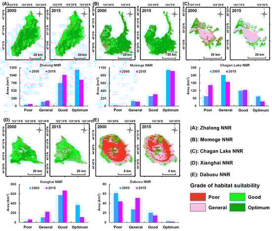 Total change areas for the different habitat suitability grades in the five NNRs are shown in Table 5. In 2015, optimum habitats covered 38.10% of the total NNR area. Good habitats were the first large area, occupying 40.96% of the total NNR area. Habitats with general and poor suitability grades accounted for an additional 12.64% and 8.30% of the total NNR area, respectively. From 2000 to 2015, optimum habitats exhibited the largest decrease by 65,840 km2—from 271,336 km2 in 2000 to 205,496 km2 in 2015. Simultaneously, habitats with poor, general, and good suitability grades increased, with poor habitats changing the most, at a rate of 88.30%. Habitats with good suitability grades for the five NNRs showed a slight area increase of 438 km2 from 2000 to 2015.
