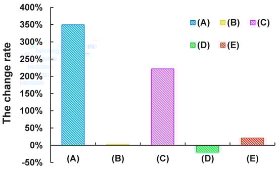 The change rate of socio-economic development and HSI in the WSP from 2000 to 2015. (a) Gross domestic product; (b) Total population; (c) Secondary industry production; (d) Habitat area in optimum and good grade; (e) Habitat area in general and poor grade.