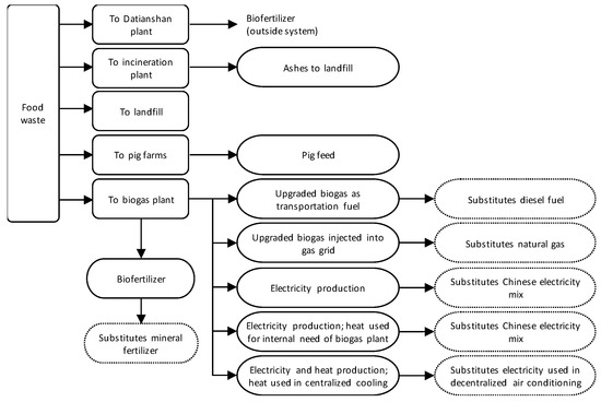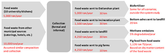 The amount of food waste that is transported to the Datianshan plant was relatively well specified, but being a well-established solution, this part of the food waste was not considered for biogas production. Instead, the shares sent to landfill, pig farms, and incineration were in focus and varied (see Table 3).