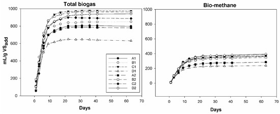 Cumulative curve of total biogas and bio-methane yield after 63 days. A, B, C, D = different restaurants/canteens; 1 and 2 = sampling day.
