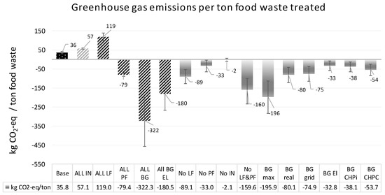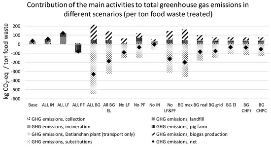 Figure 5 shows the greenhouse gas (GHG) emissions for treating one ton of food waste. In all scenarios, the production of biogas from food waste led to a net reduction of GHG emissions compared to the base scenario. Looking at the impacts of different technologies (ALL IN, ALL LF, ALL PF, ALL BG, and BG EL), it can be seen that using food waste for feeding pigs or producing biogas leads to lower GHG emissions than sending it to incineration or landfill. Upgrading the biogas leads to a greater reduction of GHG emissions than using raw biogas to produce electricity. This is based on the assumptions (see Table 4) regarding the Chinese electricity mix, natural gas, and diesel, as well as gas to electricity conversion efficiency.