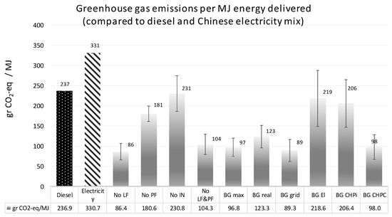 The contribution of different treatment methods, in each scenario, to the total GHG emissions, are shown in Figure 6. Depending on the output of each scenario, the substitution effects include the effect of substituting mineral fertilizers with the nutrient content of the produced digestate, the effect of substituting natural gas by upgraded biogas injected into the gas grid, the effect of substituting diesel with upgraded biogas which can be used as transportation fuel, substituting Chinese average electricity by the amount of electricity produced from biogas, and substituting electricity as a result of heat recovery from biogas CHP and using the heat in decentralized cooling system.