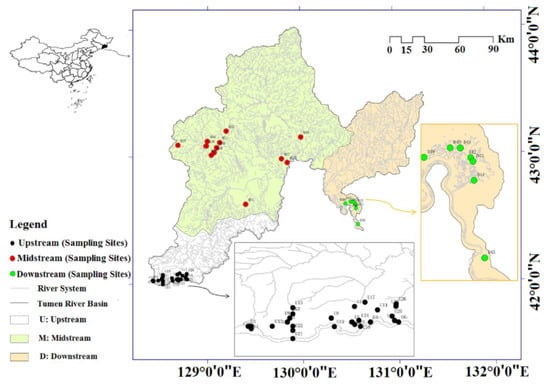 The study site (Tumen River Basin) is situated on the northeastern part of Jilin Province, China (41°59′47″–44°30′42″ N, 127°27′43″–131°18′33″ E), sharing boundaries with D. P. R. Korea and Russia (Figure 1). It is characterized by a typical temperate monsoon climate, with a mean annual precipitation of 400–650 mm. The average annual temperature is 2–6 °C, and maximum and minimum temperatures are 38 °C and −34 to −23 °C, respectively. The upstream area of the River Basin, encompasses the south of An’tu County and Helong City, and the Chinese side of Changbai Mountain. The first tributary, the Hongqi River, flows through the area. The midstream area is located in Wangqing County, south of Dunhua City, Yanji City, Longjing City, Tumen City and north of Helong City. The rivers Ga’ya, Bu’er hatong, Hailan, Yanji, and Chaoyang flow through the area. The downstream area contains Hunchun City [22]. This area is of great importance for conservation, as it is a transient habitat for endangered migratory birds. Dominant plants are herbaceous species such as Acorus calamus, Equisetum arvense, and Deyeuxia angustifolia etc.