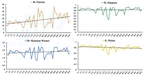 The species diversity indices applied in this study are Patrich’s R, Shannon-Wiener’s H, a complement of Simpon’s index D, and Pielou’s evenness index E [32]. The formulae for the calculation methods of these indices are shown in Table 1. Four indices were selected for the estimation of species diversity, because they have low or moderate sensitivity to sample size and have been widely used in the literature [33].
