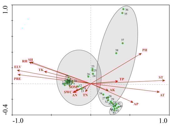 Table 6 shows the relationships of each environmental variable through Pearson coefficients. Among the 14 environmental factors, ELV played an indispensable role in many environmental factors: there was a negative correlation with pH, ST, and AT, and a strong positive correlation with TK, PRE, SH, and RH. Additionally, TN displayed a strongly positive correlation with SOM, AN, and SWC. TP had a strong positive correlation with AP, but a strong negative correlation with TK. Meanwhile, SOM was positively correlated with AN and SWC. The AN was positively corrected with SWC. AP showed a positive correlation with ST, whereas there was a clear negative correlation with PRE. Furthermore, meteorological factors had a significantly positive and negative correlation with each other.