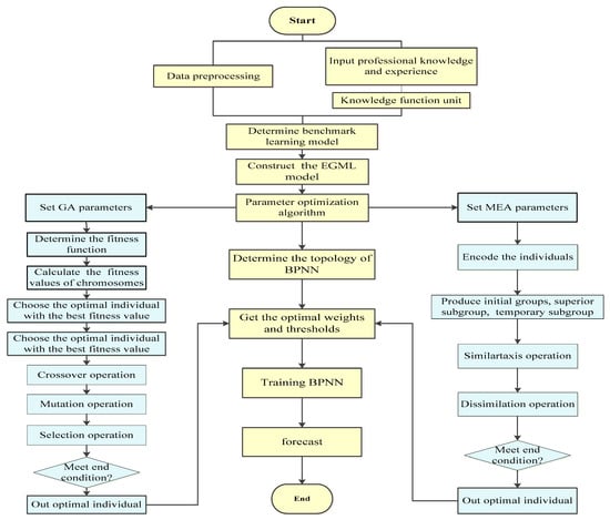 In light of the above analysis, this paper proposes a novel method called the EGML model that employs BPNN as the benchmark learning model, with GA and MEA as the optimization algorithms. Its core lies in employing the modular and mathematical expertise to guide specific learning algorithms to improve learning ability. In this model, a learning machine will be seized of a little basic expertise before mining the data rules so that it can possess a better learning environment and have a higher possibility to learn along the right path. Specifically, the introduction of expertise can provide additional information for each individual, diversify the movement of each individual and enhance each individual’s searching and exploration capability to avoid falling into local optimum. Thereby, a higher level of intelligence technique may be realized. In addition, the expertise embedded in this model will bring some corrections to the prediction results. Thus, the EGML can handle these issues with noise sample.