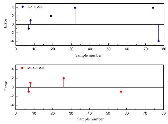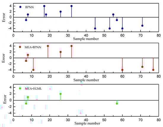 To evaluate the diagnosis performance of the proposed model, we constructed three groups of comparative experiments. The specific results of the three groups are illustrated in Figure 3, Figure 4 and Figure 5, where the horizontal axis represents the sample number of the test set, and the vertical axis represents the diagnosis error (namely, the difference between the prediction value and the actual value). The corresponding comparisons of AR for various diagnosis models are shown in Table 3. Specifically, Figure 3 shows the results of the fault diagnosis experiments conducted with the BPNN model, the GA-BPNN model, and the GA-EGML model. From Figure 3, it can be seen that the GA-EGML model produced the least number of misdiagnosis, followed by the GA-BPNN model and the BPNN model, illustrating that the former was better than the latter two. Correspondingly, Figure 4 shows the results of fault diagnosis experiments conducted with the BPNN model, the MEA-BPNN model, and the MEA-EGML model, in which the comparison result was similar to the circumstances in Figure 3. The performance of the MEA-EGML model was superior to the BPNN model and the MEA-BPNN model. Figure 5 shows the results of fault diagnosis experiments conducted between the GA-EGML model and the MEA-EGML model. It can be seen from Figure 5 that the hybrid MEA-EGML model outperformed GA-EGML in diagnosis accuracy. In addition, from the AR given in Table 3, it can be seen that all hybrid models had higher diagnosis accuracy compared to the single BPNN model and identified transformer faults more effectively. However, the accuracy of the EGML models were higher than that of the other hybrid models since the self-learning ability and robustness of the BPNN model had been greatly improved. Moreover, the MEA-EGML model had a higher accuracy rate than the GA-EGML model. The specific analyses of the experimental results are as follows.