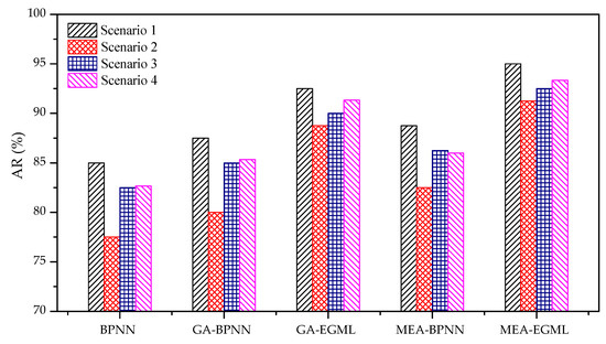 Scenario 1 was discussed in the previous section. To evaluate the fault diagnosis performances of different models under four scenarios, scenario 1 was considered as a control group. The comparisons of AR for different diagnosis are illustrated in Figure 6. As can be seen from Figure 6, the AR of all models in other scenarios declined compared to scenario 1, especially in scenario 2. In scenario 2, the traditional models, namely, the single BPNN model, the GA-BPNN model, and the MEA-BPNN model, decreased by 8.82%, 8.57%, and 7.04% in terms of AR, respectively. Among them, the AR of the BPNN model in scenario 2 only reached 77.5%, suffering the greatest decline, which had not met the accuracy requirements of power transformer diagnosis. Compared to them, the accuracy of the proposed GA-EGML model and MEA-EGML model was decreased slighter, with decrease rates of 4.05% and 3.95%, respectively. Different from scenario 2, the AR of all models in scenario 3 only decreased slightly and there was no obvious difference in terms of decrease amplitude between the traditional models and the EGML models. In scenario 4, the AR of each model also had a slight decline but the decline amplitude of the models proposed in this paper was lower compared to the traditional models. The reason for these phenomena is that the mechanism of knowledge function in the EGML model is different from that of the traditional cost function. The cost function only establishes a rule excavating mechanism for training data while the knowledge function extends a single learning mechanism based on data mining to the learning mechanism integrating training samples with expertise. Through knowledge function, the movement of the individual is diversified, and the exploration capability and searching behavior of each individual are strengthened, which can avoid premature convergence. Additionally, the EGML model depends on not only the mining of data regulars, but also the guidance of expertise, which brings some corrections to the prediction results. Thus, the impact of noise samples and small sample size on it is smaller than that on the traditional models. In the above four scenarios, both the GA-EGML model and MEA-EGML model obtained higher diagnosis accuracy, and the latter was better. Especially in scenario 2 and scenario 4, the proposed models were less affected by the sample data than the traditional model, which suggests the EGML model is more favorable compared to the traditional models when the number of sample data is limited or noise sample may exist. In engineering practice, it is difficult to obtain a large collection of sample data in many vertical areas, or the cost of data collection is too high. Even if there are ample samples, it is also difficult to ensure that no noise samples exist. Thus the EGML model is particularly beneficial to the fault diagnosis due to its powerful ability to deal with these problems of less sample data and noise samples in engineering practice.