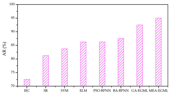 To illustrate the diagnosis performance of the proposed model, this paper used scenario 1 for comparative experiments among different diagnosis models. In this section, the single IEC, softmax regression (SR), SVM, and ELM were constructed to diagnose the power transformer faults. In addition, BA and PSO were employed to optimize the single BPNN model for diagnosis. Fault diagnosis results of different models are shown in Figure 7. From Figure 7, it can be seen that the proposed models, including both GA-EGML and MEA-EGML, yielded higher AR than other traditional models, which were 92.5% and 95%, respectively. However, the IEC has the worst diagnosis performance, and its AR only reached 72.5%, which does not meet the accuracy requirements of power transformer fault diagnosis. In addition, the AR of other models, except the IEC and the proposed model, are also not satisfactory, ranging from 81.25% to 87.5%.
