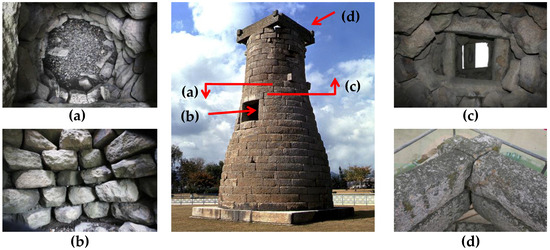 The photos of exterior and interior of Cheomseongdae: (a) Filler beneath the 13th layer; (b) Inner irregular-shaped stones; (c) Long-shaped horizontal tie stones of 19th, 20th, 25th and 26th layers; and (d) Grid of interlocking stones and half-lap joint [21].