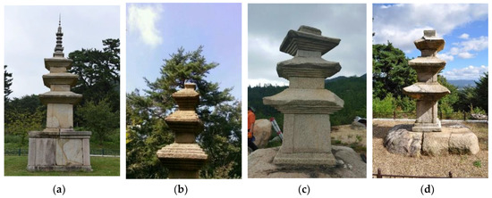 Typical damages to stone pagoda caused by 9–12 Gyeongju Earthquake (Photo by NRICH): (a) Separated third-story body stone, three-story Stone Pagoda at Cheollyongsa Temple Site in Namsan Mountain; (b) Rotated stone member, displaced third-story body stone, three-story Stone Pagoda of Yongjanggye Jigok Valley in Namsan Mountain; (c) Rotated body and roof stones, three-story Stone Pagoda of Bipagok Valley in Namsan Mountain; and (d) Displaced third-story body and roof stones, rhree-story Stone Pagoda of Jiamgok Valley in Namsan Mountain.