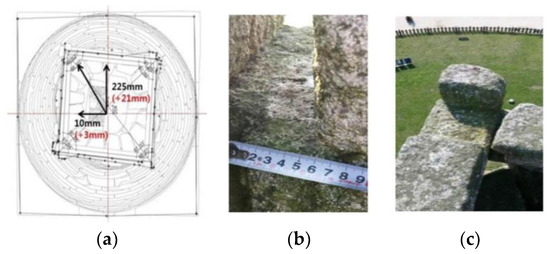 Displacement of Cheomseongdae headstones caused by the 9–12 Gyeongju Earthquake: (a) Displacement and rotation of headstones; (b) Displacement measurement of headstones; and (c) Separation of headstones on southeast corner.