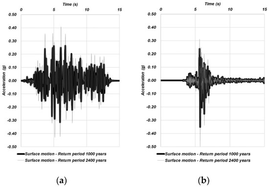 Figure 4 shows the results of the Cheomseongdae ground response analysis for the Ofunato Earthquake motion and the Gyeongju MKL (N-S component) motion. The waveforms of the latter had a shorter duration of strong motion than those of the former with a similar peak acceleration value. Based on a threshold acceleration of 0.05 g, the bracketed durations Td were 11.35 s and 3.23 s for the Ofunato and Gyeongju earthquakes, respectively. Moreover, the Arias intensity Ia values [27] used for a quantitative calculation of the duration of strong motion were 0.0335 and 0.0039 m/s for the Ofunato and Gyeongju Earthquake motions, respectively.