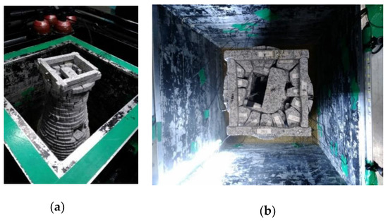 To analyse Cheomseongdae’s seismic behaviour characteristics, 1/15-scale models were created, and dynamic centrifuge model testing was performed using a centrifuge device and shaking table from the KAIST Geo-Centrifuge Testing Center [28,29]. The scaling factors were considered by applying a 15 g centrifugal force vertically, which is 15 times the gravitational acceleration, to the 1/15-scale Cheomseongdae model. Hwangdeung granite was used for the model members because its density and stiffness are closest to those of the material at Cheomseongdae. This enhances the plausibility of reproducing the actual seismic behaviour of Cheomseongdae.