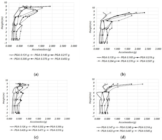 Peak acceleration values measured at various heights in the two Cheomseongdae models: (a) Ofunato earthquake motion in original model; (b) Ofunato earthquake motion in Cheomseongdae model without headstones; (c) Gyeongju Earthquake motion in original model; and (d) Gyeongju Earthquake motion in Cheomseongdae model without headstones.