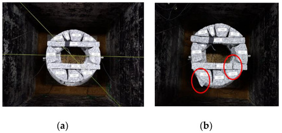 Broken stone beam of 19th layer after seismic excitations: (a) Before testing; and (b) After testing.