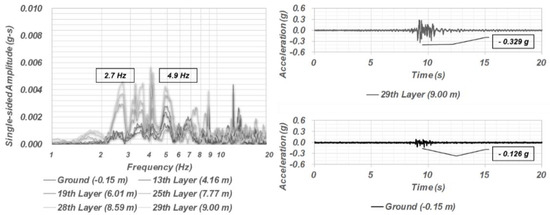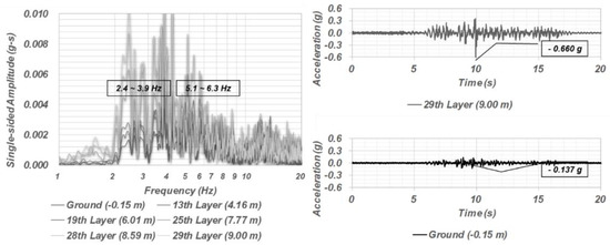 Figure 8 shows the frequency response of the structure exposed to the Ofunato earthquake motion with a 0.137 g-level surface peak acceleration. A peak acceleration of 0.660 g was measured at the upper headstone (29th layer), and partial amplification occurred in the 2.4–3.9 Hz and 5.1–6.3 Hz bands. The amplification profile was not clearly discernible. This may be due to the complex mode shape of the structure, which was composed of nearly 400 members. Figure 9 shows the frequency response of the structure exposed to the Gyeongju Earthquake motion with a 0.126 g-level surface peak acceleration. A peak acceleration of 0.329 g occurred at the topmost layer, and partial amplification occurred at 2.7 and 4.9 Hz.