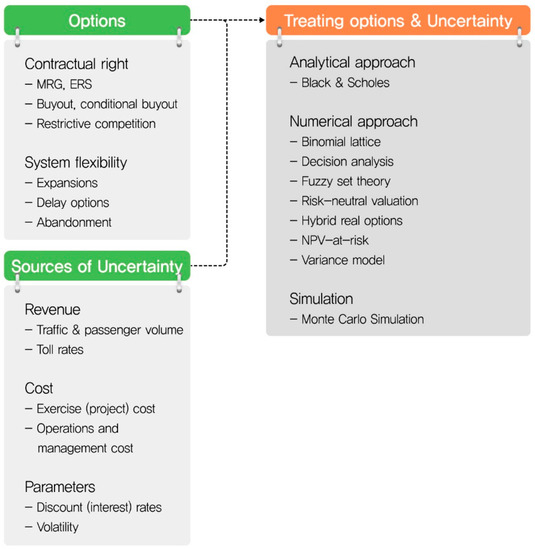 Because real options are delivered in different forms to represent characteristics of the underlying assets and its contingent nature, a rich repertory of methodologies has been proposed to correctly model and evaluate real options. Broadly speaking, the methodologies can be categorized into three groups: analytical methods, numerical methods, and simulation methods [6]. Except for the analytical approach, one methodology is not necessarily used for one purpose only, but for many other purposes (Figure 1). This is probably due to the fact that real options involve a complicated and dynamic process of real options analysis. For example, the MCS is applied to deal with the uncertainty in traffic forecasts by randomly generating a number of different values, but the binomial lattice plays an identical function in [1]. These binomial lattices are also applied to a methodology for reflecting flexibilities [18,19]. Following is the summary of the methodological development for valuing options, which explicitly considers uncertainty.