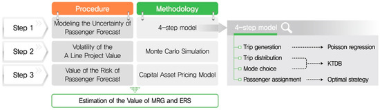 The purpose of this study is to investigate the effects of exercise conditions on the value of MRG and ERS. In order to correctly value the contractual guarantees under the exercise conditions, the study adopts the risk-neutral valuation method because this method is known to be advantageous for treating the uncertainty in passenger forecasts (so far, traffic forecast has been used for ease of understanding, hereafter, traffic forecast has been replaced with passenger forecast in accordance with the case project) and the market risk in the valuation of the guarantees [1]. The risk-neutral valuation approach is effective when the risk-adjusted probabilities of the underlying asset are available because once the probabilities are identified, the option payoffs are just simply computed by applying the risk-free rate, which implies that the future risk-adjusted discount rate is not necessary. The risk-neutral approach is adequate for achieving the objective of the study where the uncertainty in passenger forecasts is explicitly dealt with risk-adjusted probabilities using the specialized analysis framework. The following describes the preliminary procedure and methodology dedicated to finding the value of MRG and ERS of the underlying project by reflecting the uncertainty in passenger forecast (Figure 2).