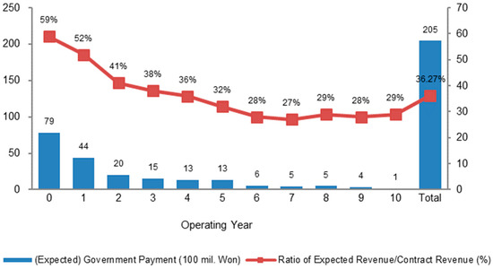 For the opening years, the ratio of the expected revenue to the contract revenue was estimated at 59% and the expected government payment was analyzed as 7.9 billion KRW. The amount of government payment decreased as the chances that the expected revenue would exceed 50% of the contract revenue (exercise conditions for the MRG) became low. The ratio of the expected revenue to the contract revenue in actual operating years decreased over the 10 years of the operating period.