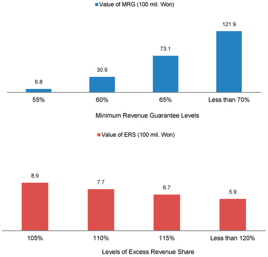 Figure 6 shows the value of MRG and ERS by changing the amount of revenue guarantee and share of the excess revenue while keeping the current exercise conditions for the MRG. As expected, the value of MRG increases as the level of revenue guarantee increases whilst the value of ERS decreases as the share of the excess revenue increases. As a result, the balancing of the MRG and the ERS conditions does not hold much meaning since it is much more likely that the expected revenue would not exceed 50% of the contract revenue. Considering the value of ERS (520 million KRW), it could have been a fair contract if the range of revenue guarantee was set at a level of less than 55% instead of 70~80%.