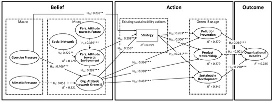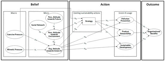 To develop the belief formation of our conceptual model, we relied on previous studies that analyzed the organizational motivations for adopting Green IS or Green IT. Authors established that external pressures shape executives’ personal beliefs and result in sustainability actions [1,21]. Therefore, this study incorporates institutional theory to identify main motives for adoption of Green IS. Based on these theoretical lenses, three types of pressures could be emphasized, namely coercive isomorphism, mimetic processes, and normative pressures [70]. However, we followed the approach of Chen, Boudreau, and Watson [71] who focused on two types of isomorphic pressures—mimetic and coercive pressures. The mimetic pressures (i.e., organizations will follow leading organizations that have already taken up Green IS initiatives) are important, since they drive organizations to adopt Green IS practices due to the positive outcomes shown by other organizations’ Green IS practices [10]. It could also be argued that when organizations are faced with high level of environmental uncertainty, they may mimic the action of an organization they deem as being legitimate [70,72]. Hence, this study advocates that pressures from competitors and other stakeholders influence the adoption and diffusion of Green IS by SMEs. Furthermore, the coercive pressures (i.e., externally codified rules, norms, or laws that give legitimacy to business practices) have a significant impact on sustainable development as concerns SMEs [73]. Deng and Ji [6] reported that regulations, environmental laws as well as demands from key stakeholders require organizations to operate in an environment-friendly way and force them towards more of an eco-style. Accordingly, like with Gholami et al. [21] and Deng and Ji [6], we assumed that mimetic pressure and coercive pressure will positively affect the organizational attitude to Green IS (H1 and H2b), while coercive pressure is positively associated with a sustainability-oriented organization strategy (H2a). However, it has been found that Green IS implementation is not a pure organizational phenomenon driven by external pressures but a collective behavior involving individual and institutional effort for the ecological goal at large [68]. Therefore, we agree with Gholami et al. [21] who argued that managers’ attitudes and beliefs about the natural environment motivate organizational action to intensify Green IS adoption (H5a). Further, we presumed that the manager’s personal attitude to the environment is positively influenced by their attitude to the future (H4) and by their social network (H3). In our opinion, if a person is concerned about the future, they are most likely also concerned about the environment. Besides, some prior studies suggested a positive correlation between social network use and attitudes about the environment ([74] as cited in [1]). Finally, similarly as Loeser et al. [9], we conceptualized personal attitude to the environment and organizational attitude to Green IS as an antecedent of a sustainably oriented organizational strategy (H5b and H6a). The authors [9] also provided evidence suggesting that environmental orientation of an organization positively affects the implementation of Green IS practices. Therefore, we presumed in our model that the organizational attitude to Green IS is positively associated with the Green IS practices, i.e., the use of IS for preventing pollution (H6b), product stewardship (H6c), and sustainable development (H6d).