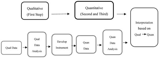 In this study, a mixed method research design was used to reveal expert opinions about the concept of environmental literacy. This type of research design combines qualitative and quantitative data [49] (p. 14), which provides a more comprehensive coverage of the research topic [50]. The exploratory sequential design, a type of mixed method research, was used. Through the exploratory sequential design, the results of qualitative research are the basis for subsequent quantitative research, as can be seen in Figure 1 [51].