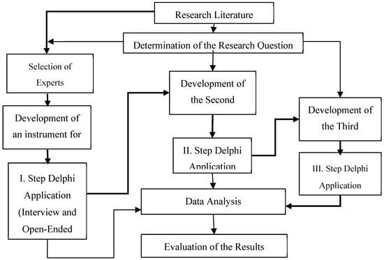 The Delphi technique prevents participants’ direct discussion with each other, and through interviews or questionnaires, participants can question the situation repeatedly [63]. It is used as a means of providing consensus among experts in situations where there are differences of opinion [64]. In this study, the Delphi study was carried out in three steps, as seen in Figure 2. Each round contained the data collection tool, the collection of data, and the analysis of these collected data.